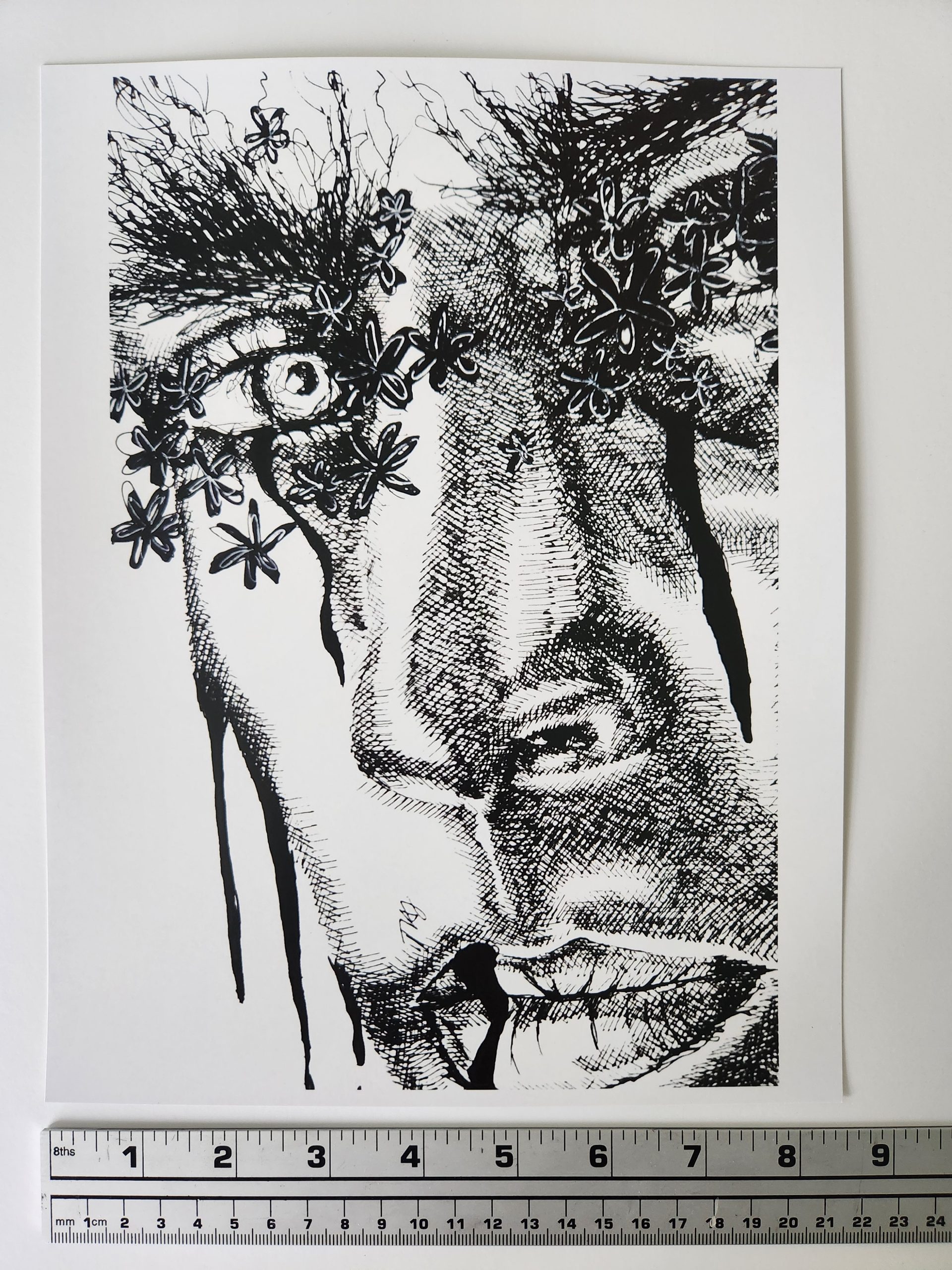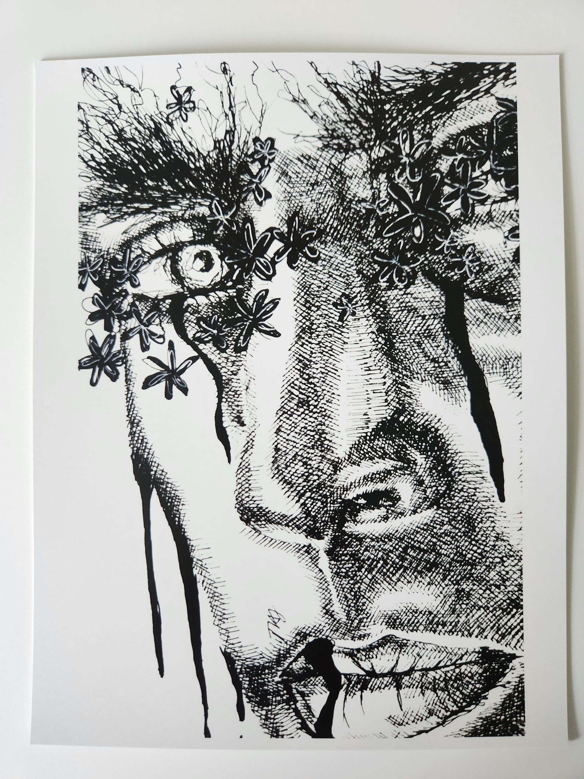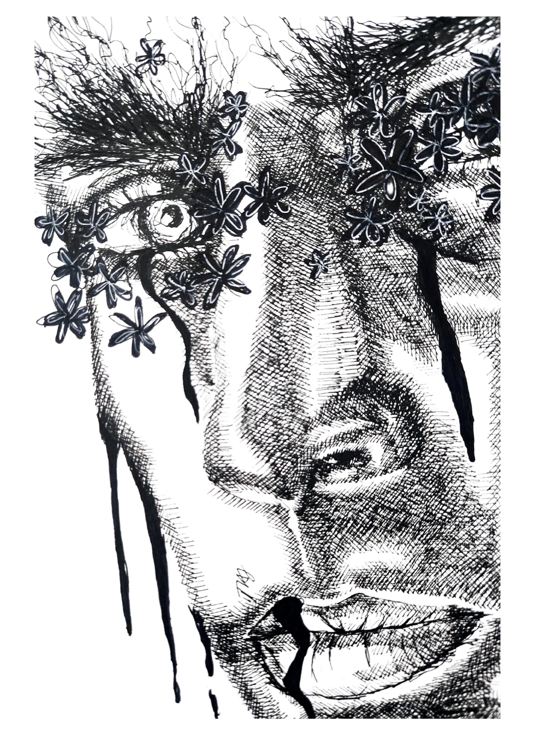 This piece- Beautiful Obscurity is special to me because of the perspective it creates. The close up of this face, eyes hidden by flowers tells a story of wandering with serious tones hidden underneath. The delicate lines of ink, all layered together to create this detailed piece is sure to strike your eye each time you see it.